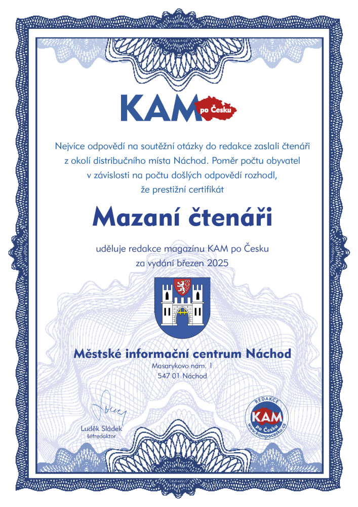 Nejvíce odpovědí na soutěžní otázky do redakce zaslali čtenáři z okolí distribučního místa Náchod. Poměr počtu obyvatel v závislosti na počtu došlých odpovědí rozhodl, že prestižní certifikát
