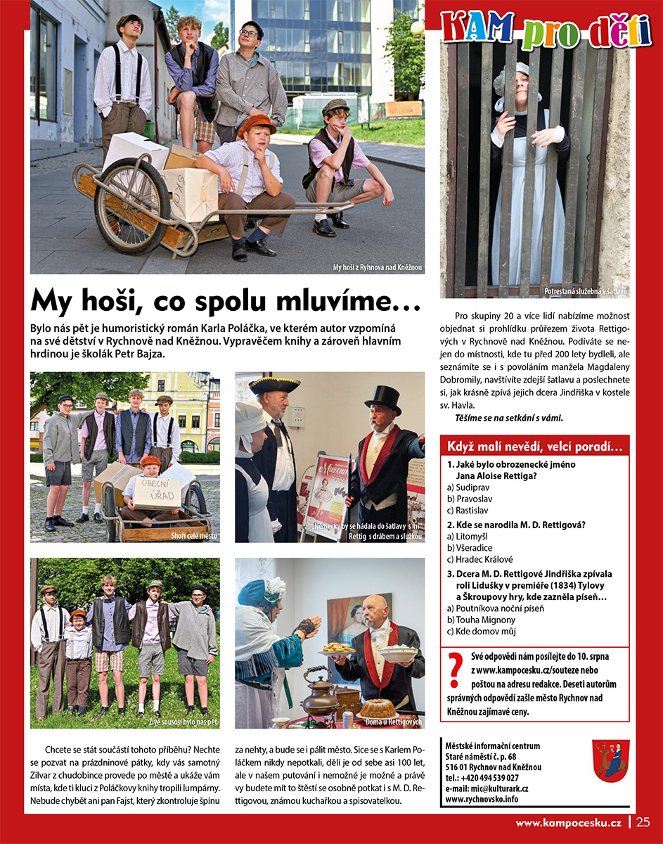 Chcete se stát součástí tohoto příběhu? Nechte se pozvat na prázdninové pátky, kdy vás samotný Zilvar z chudobince provede po městě a ukáže vám místa, kde ti kluci z Poláčkovy knihy tropili lumpárny. Nebude chybět ani pan Fajst, který zkontroluje špínu za nehty, a bude se i pálit město. Sice se s Karlem Poláčkem nikdy nepotkali, dělí je od sebe asi 100 let, ale v našem putování i nemožné je možné a právě vy budete mít to štěstí se osobně potkat i s M. D. Rettigovou, známou kuchařkou a spisovatelkou.