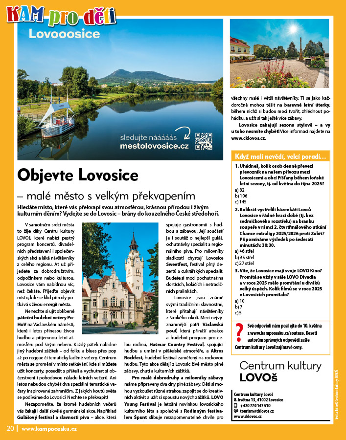 V samotném srdci města to žije díky Centru kultury LOVOš, které nabízí pestrý program koncertů, divadelních představení i společenských akcí a láká návštěvníky z celého regionu. Ať už přijedete za dobrodružstvím, odpočinkem nebo kulturou, Lovosice vám nabídnou víc, než čekáte. Přijeďte objevit místo, kde se klid přírody potkává s živou energií města.