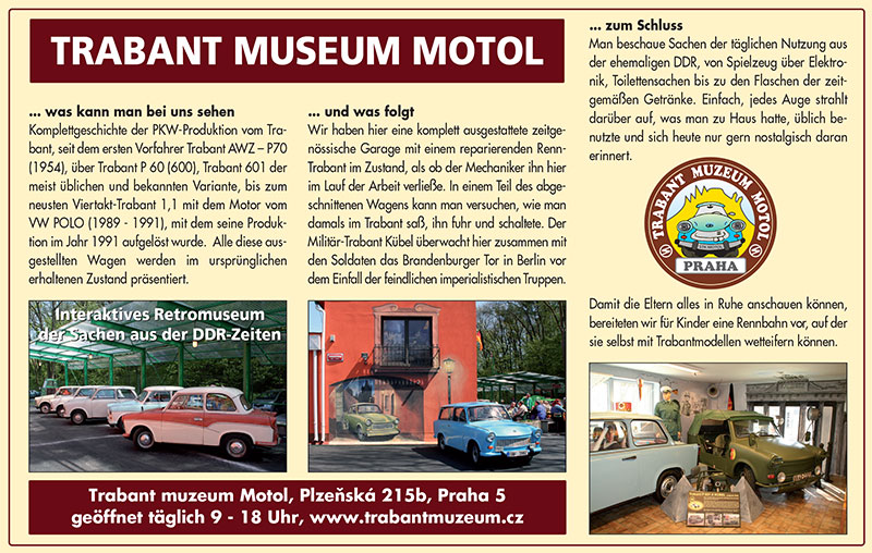 Trabant muzeum Motol Plzeňská 215b, Praha 5 geöffnet täglich 9 - 18 Uhr,