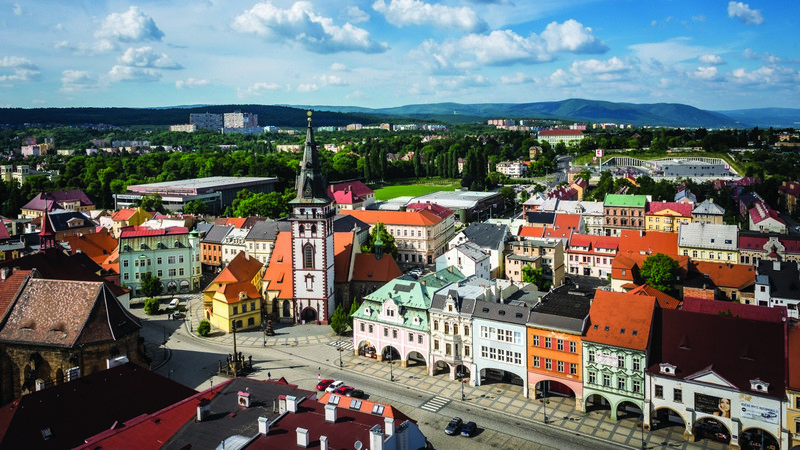 Historisches Zentrum mit Gebäuden der verschiedensten architektonischen Stile liegt rings um den Platz Náměstí 1. máje. Die wertvollste Sehenswürdigkeit ist die frühgotische St. Katharinenkirche aus dem letzten Drittel des 13. Jahrhunderts in der rechten Oberecke des Plaztes. Die Kirche bildet eine Einheit mit dem altertümlichen Rathaus, der ehemaligen Kommende des Ordens der Deutschen Ritter. In der gegenüberliegenden Ecke des Platzes ragt der Stadtturm empor. Das 54 m hohe Wahrzeichen des historischen Stadtkerns wurde in der Hälfte des 16. Jahrhunderts fertiggestellt. Der ganze Südrand des historischen Zentrums wird mit dem weiträumigen Jesuitenkomplex aus dem 16. Jahrhundert bebaut. Im Areal befi nden sich Gebäude des ehemaligen Jesuitengymnasiums, Internat, Speicher, Arkadenhof und Kirche des Hl. Ignaz aus der Hälfte des 17. Jahrhunderts vom italienischen Architekten Carl Lurago.
