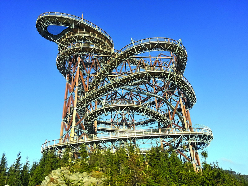 Man begebe sich nach Ostböhmen, nach Dolní Morava (Nieder Mohrau). Man gewinnt hier die einzigartige Möglichkeit, in den Wolken zu spazieren! Der einmalige Bau des Pfads in den Wolken befi ndet sich unweit der Hütte Slaměnka, in der Nähe der oberen Station der Seilbahn, in der Höhe 1116 m über dem Meer und man kann den schönen Rundblick auf das ganze Massiv von Kralický Sněžník von hier genießen. Die Höhe des Pfads ist 55 m und den Gipfel betritt man bequem auf dem Holzsteg sogar in den Skischuhen oder mit dem Kinderwagen. Für die Mutigeren steht eine 101 m lange Rutsche für den Rückweg abwärts zur Verfïgung.