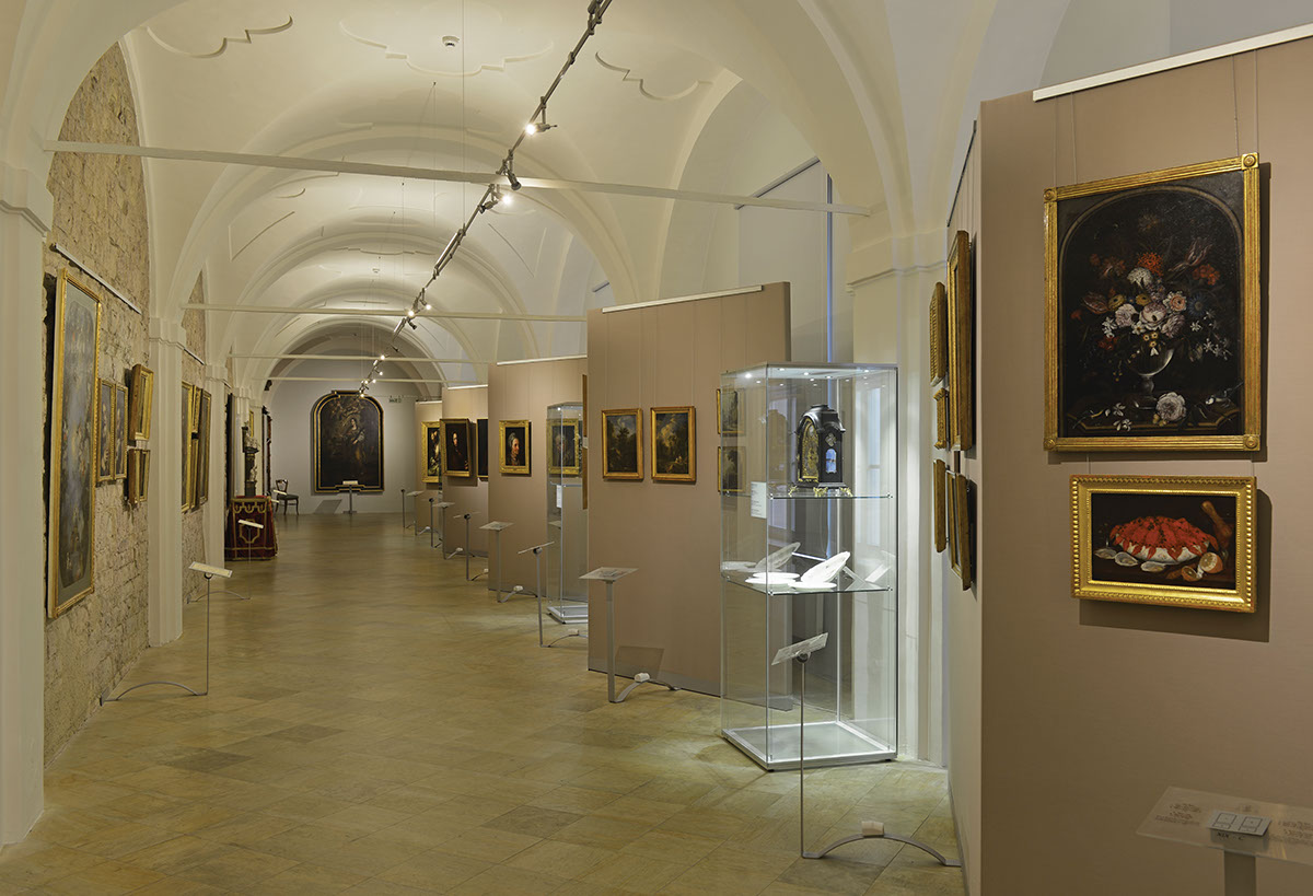 Man bewundere im Geschoss mehr als zwei Hundert Gemälde aus der Sammlung der Gemäldegalerie vom Strahov, die dank der Sammlungstätigkeit der hiesigen Äbte bereits im Jahr 1836 entstand. Autoren der Gemälde sind bedeutende Maler von der Gotik bis in die Hälfte des 19. Jahrhunderts. Neben der sehenswerten Sammlung der gotischen Tafelgemälde wird man von der Sammlung der manieristischen Bilder gefesselt, von denen einige in den Sammlungen von Rudolf II. ursprünglich untergebracht wurden, unter anderem gibt es hier Werke von B. Spranger, J. Heintz und Q. Ravesteyn. Neben der großen Sammlung der flämischen Malerei gibt es hier auch viele Werke der mitteleuropäischen Maler des 18. Jahrhunderts.
