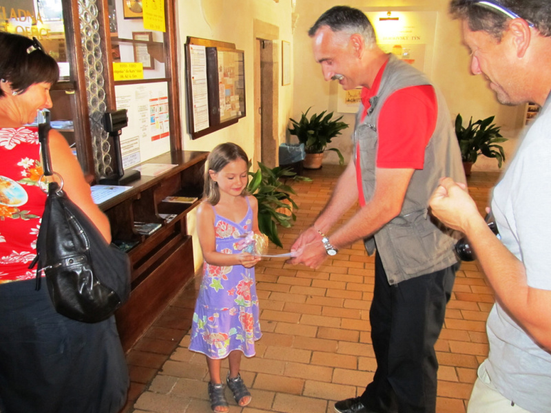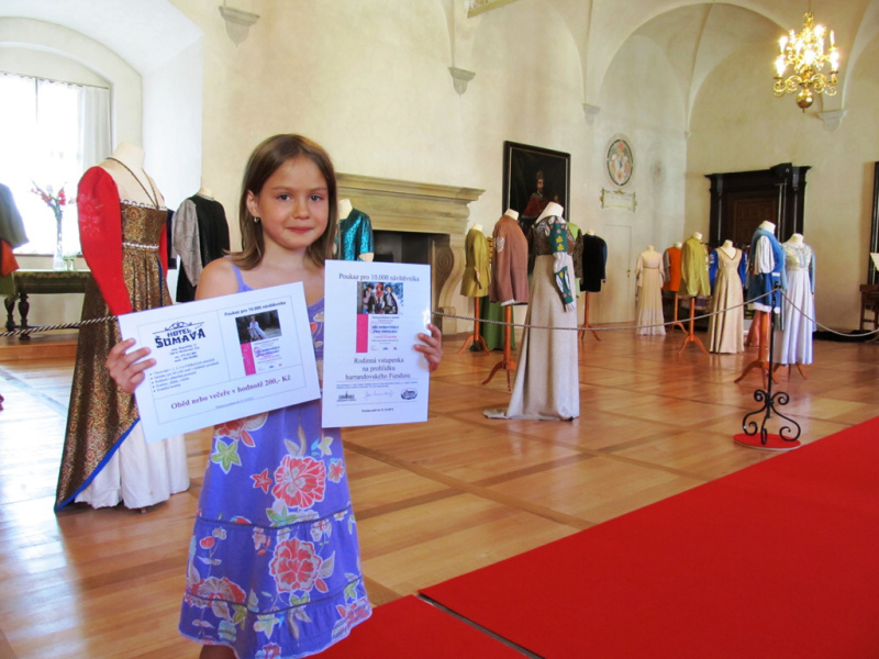 Z 360 km vzdálených Kanic u Brna doputovala na výstavu i sedmiletá Alžběta Jeřábková s rodiči. Stala se desetitisícím návštěvníkem úspěšné výstavy, která připomíná natáčení oblíbené filmové pohádky Tři oříšky pro Popelku. V pokladně zámku ji očekával kastelán Jan Rosendorfský, který jí předal volnou vstupenku na výstavu, poukaz na oběd v hotelu Šumava a rodinnou vstupenku na prohlídku barrandovského Fundusu. Na výstavě ji provázel průvodce Martin Lang, který říká: „Malá slečna se styděla a moc nám toho neřekla, ale bylo vidět, že by moc ráda byla Popelkou v plesových šatech.“