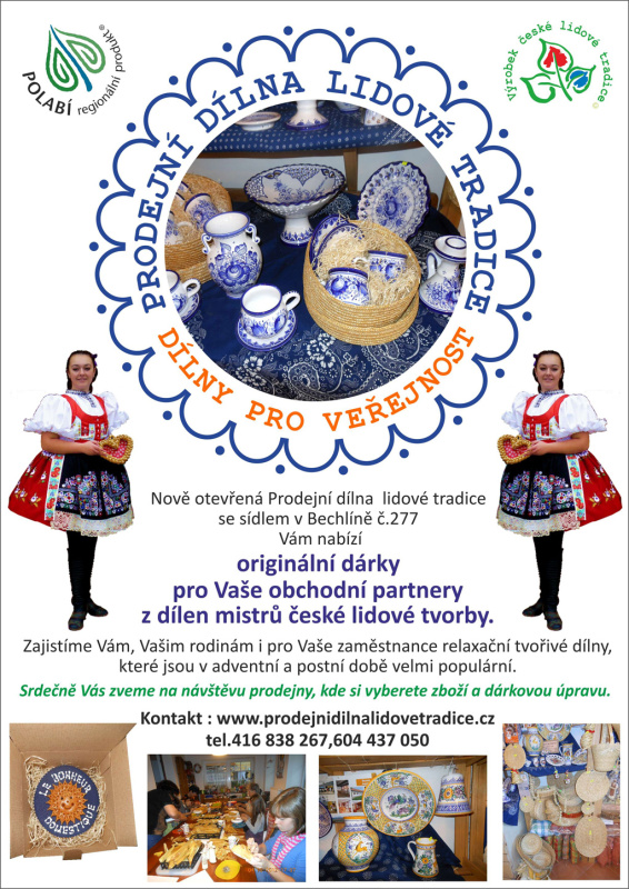 Prodejní dílna lidové tradice se sídlem v Bechlíně č.p. 277 pořádá dílny pro širokou veřejnost, kde si budete moci vyzkoušet práci s kukuřičným šustím, modrotisk či výrobu nekynutého (vizovického) těsta.