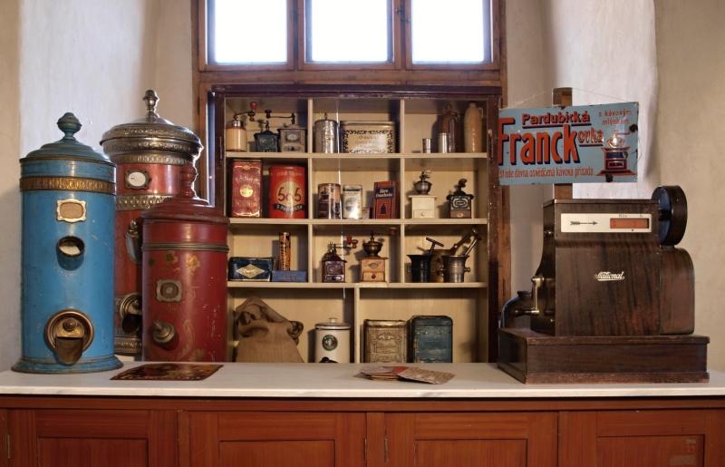 Na výstavě je zastoupena nejen pravá zrnková káva, ale také její náhražky, například káva žitná či ječná. Kromě celé škály předmětů vztahujících se k této problematice, jako jsou hmoždíře, kafemlýnky, pražičky, dózy na kávu, hrnky a kávové soupravy, mohou návštěvníci shlédnout tři výjevy. Část interiéru kavárny, venkovský výjev s podáváním kávy a interiér obchodu se zaměřením na prodej kávy a kávovin.