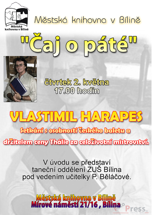 V rámci setkávacích pořadů "Čaj o páté" máte možnost se s hostem setkat osobně ve čtvrtek 2. května od 17 hodin v Městské knihovně v Bílině. Na pořadu bude nejen vyprávění o baletu, o filmových zkušenostech, o životě, který byl vždy s tancem spojený, ale i milý hudební příspěvek hosta.