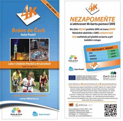 Tou první je přejmenování na 4K kartu. Ptáte se proč? Odpověď je snadná. Číslice 4 totiž znamená počet kamenů v logu projektu Brána do Čech, a protože naše destinace vznikla díky tomuto projektu, úzce s ním spolupracuje a zároveň nese i jeho logo. Další změnou je nový systém, který využívá IT technologií. Naší snahou byla jednoduchá dostupnost karty a její pořízení. Návštěvník tedy zašle SMS zprávu ve tvaru DADP na číslo 90206 a následně obdrží unikátní kód, který nahlásí při své návštěvě a získá zvýhodněné vstupy do zámků, muzeí, sportovních zařízení, zooparku a dalších asi 30 turistických atraktivit a služeb v oblasti Dolního Poohří a Krušnohoří. Třetí novinkou 4K karty je pouze její jeden typ, a to 3denní, platí tedy 1. den dle aktivace a následně 2. a 3. den 24 hodin a s cenovým rozpětím 190–590 Kč. Nejde tedy o klasickou papírovou kartu, ale jedná se spíše o virtuální kartu, která je první svého druhu v naší republice. Zároveň jsme sami zvědavi na počet využití a zda návštěvníci budou spokojeni s tímto systémem. Pokud se osvědčí, tak bychom jej rádi rozšířili do dalších oblastí Ústeckého kraje. Další informace naleznete na www.4kkarta. cz.