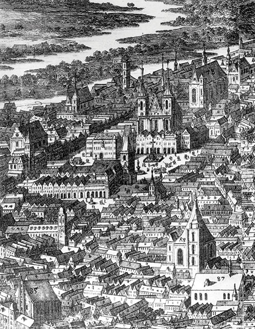 Ani Přemyslovci to neměli s rozvojem Prahy jednoduché. Vlastnili sice levý břeh s Hradčany, ale pravý, mnohem vhodnější pro rozvoj města, patřil Slavníkovcům. Tedy až do neděle 28. září 995, kdy je na blatném hradišti Libice Přemyslovci povraždili, a získali tak i pravý břeh vltavský. Využití pravobřežních rovin se ale protáhlo. Přesto už začas kolovala mezi kupci zvěst o Praze a o jejím novém velkém tržišti, poskytujícím veškerý kupecký komfort. Navíc bylo dobře opevněné – otýněné, a tak vznikl také název Týnský dvůr. Poplatek za zboží, muly a koně časem nahradilo clo – německy Ungeld, podle kterého dostal svůj název i dvorec Ungelt. Velkoměsto sice rostlo, ale dostat se z Hradčan na nové tržiště znamenalo ráchat se tam i zpět vodou. Chtělo by to most, řekl si nejspíš Vladislav II. poté, co dřevěnou lávku vzala roku 1159 velká voda. Nechal tedy postavit první most, kamenný, co pevný měl být dost, a pojmenoval ho po manželce Juditě. Přišel pokrok, rozvoj řemesel, stavělo se ostošest a Praha patřila mezi první evropská města, kde se ulice dláždily (Kaprova ul. již ve 13. století). Dláždění ještě urychlil Jan Lucemburský, který věnoval staroměstským měšťanům veškeré clo z vína a mýtné z vozů, co přijely do Prahy, výměnou za další dláždění ulic.