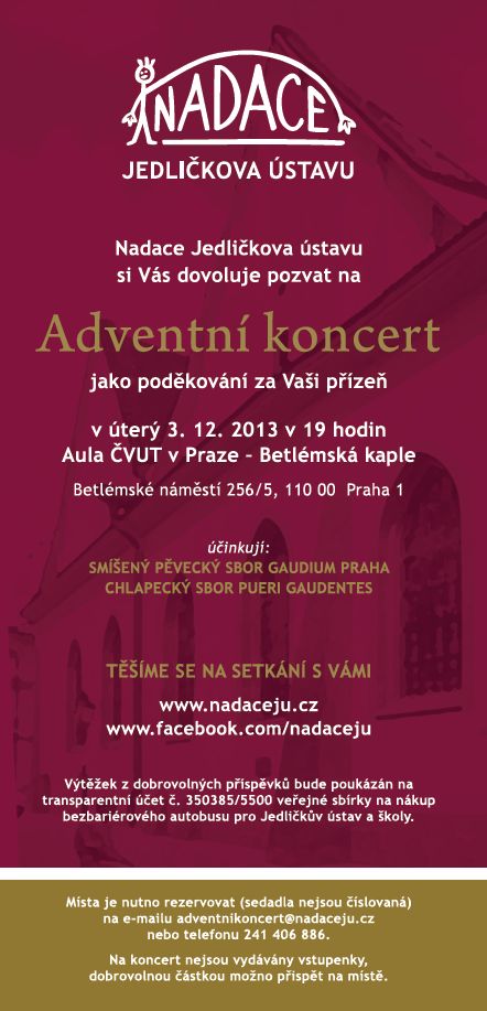 Případný výtěžek z dobrovolného vstupného bude opět přidán do dlouhodobé sbírky na bezbariérový autobus pro Jedličkův ústav a školy. Na koncert se vstupenky nevydávají, je proto nutné zarezervovat si místo na mailové adrese adventnikoncert@nadaceju.cz