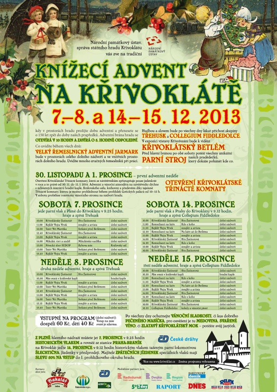 Královský hrad Křivoklát bude s prvním adventním dnem (30. listopadu) oděn do slavnostního vánočního roucha, které si ponechá až do 12.1.2014. Návštěvníci najdou po celé toto období hrad zahalený do jedinečné vánoční výzdoby, která je novinkou nejen letošního křivoklátského Knížecího Adventu. Vánoční atmosféra na návštěvníky dýchne z úchvatných interiérů hradní kaple, Královského sálu, knihovny a především díky zpřístupnění tajemné Křivoklátské Třinácté komnaty, která se návštěvníkům otevře pouze jedenkrát v roce a to právě v tomto období. Jedinečné hradní prostory budou vyzdobeny v duchu českých tradic, zvyků a pověr. Na sv. Ondřeje, 30. 11. 2013 začneme období adventního klidu a rozjímání, rozsvícením křivoklátského vánočního stromu na hradním nádvoří. Vrcholem předvánočního času bude tradiční velký Knížecí adventní jarmark, který se bude konat o víkendech 7.-8.12. a 14.-15.12., a opět bude okořeněn ukázkami řemesel, kde najdete i milý vánoční dárek, nebudou chybět divadelní, hudební a kejklířské vystoupeními atd. Zazní Rybova mše v Královském sále (7.12). Při příležitosti Knížecího adventního jarmarku budou na hrad Křivoklát vypraveny i speciální historické parní vlaky z Plzně (7.12.) a z Prahy (14.12.).