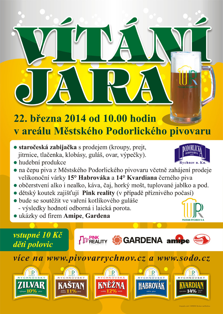 Na 22. 3. 2014 chystáme tradiční akci Vítání Jara. Při této akci se začnou čepovat naše speciály, které vaříme právě pro tuto akci a pro období vánočních svátků. Dále na této akci probíhá soutěž ve vaření kotlíkového guláše, kdy 12 družstev bude hodnotit odborná i laická porota, budou se zde prodávat zabijačkové speciality.