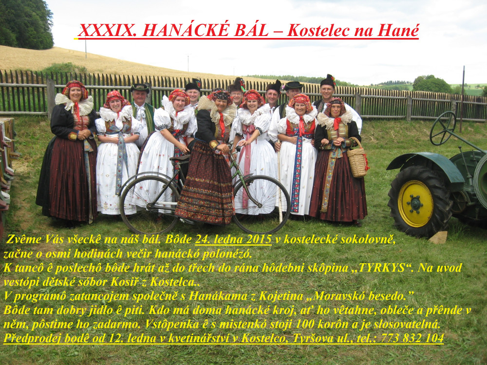 Zvéme Vás všecké na náš bál. Bóde 24. ledna 2015 v kostelecké sokolovně, začne o osmi hodninách večir hanáckó polonézó.