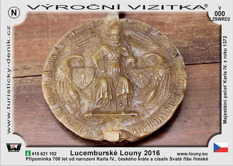Ptáte se proč Lucemburské Louny a nikoli Louny Karla IV.? Velký císař v Lounech jaksi nikdy nebyl. Leč jako královskému městu Lounům udělil několik privilegií a obchodních výsad. Jeho syn a král Zikmund městu také mnohým prospěl, například mu navrátil majetky a privilegia ztracená za husitských válek. Projekt zahájí 6. ledna komponovaný hudební program Daniela Dobiáše a Táni Fischerové „Poselství Karla IV.“. Od toho dne bude následovat nepřeberné množství přednášek, výstav, koncertů, workshopů a zájezdů, jež budou úzce propojeny s dobou vlády Karla IV. V oblastním muzeu můžete například navštívit již zmíněný Karlštejnský poklad nebo v divadle Vrchlického vyslechnout koncert věnovaný době Karla IV. Také na turisty-sběratele bude v Lounech pamatováno. V městském infocentru si mohou nejen objednat tematické vycházky i přednášky, ale také od 2. ledna zakoupit speciální výroční turistickou vizitku „Lucemburské Louny 2016“ a do deníčků obtisknout speciální výroční razítko. Více informací o chystaných akcích naleznete na www.louny.eu nebo přímo kontaktujte městské infocentrum.