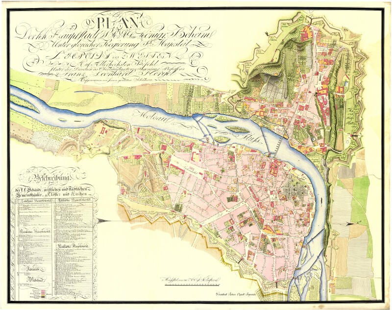 Kolorovaný rukopis je ojedinělým kartografickým dílem své doby. Obsahuje první domovní číslování zavedené v roce 1770 a platné do roku 1805. Je orientován k západu, s Hradčany a Malou Stranou nahoře. V levé dolní části plánu je umístěn seznam význačných budov s popisnými čísly a vysvětlující text. Tabulka objasňuje barvy, jichž bylo v plánu použito pro rozlišení budov císařských, duchovenských, soukromých a panských, dřevěných a židovských. Plán vznikl u příležitosti korunovace Leopolda II. na českého krále, pravděpodobně jako dar. Rukopis plánu byl objeven v roce 1941 v knihovně na zámku Kačina.