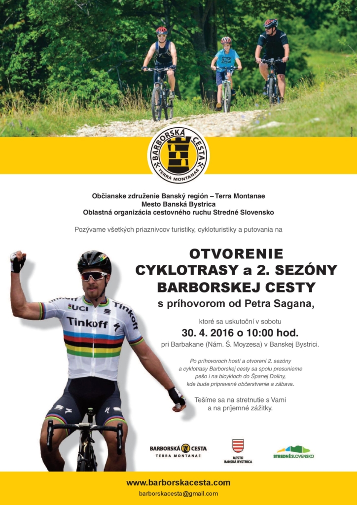 pozývame všetkých priaznivcov turistiky, cykloturistiky a putovania na OTVORENIE CYKLOTRASY a 2. SEZÓNY BARBORSKEJ CESTY s príhovorom od Petra Sagana, ktoré sa uskutoční 30. apríla 2016 (sobota) o 10:00 hod. pri Barbakane (Nám. Š. Moyzesa) v Banskej Bystrici. Po príhovoroch hostí a otvorení 2. sezóny a cyklotrasy Barborskej cesty sa spolu presunieme pešo i na bicykloch do Španej Doliny, kde bude pripravené občerstvenie a zábava.