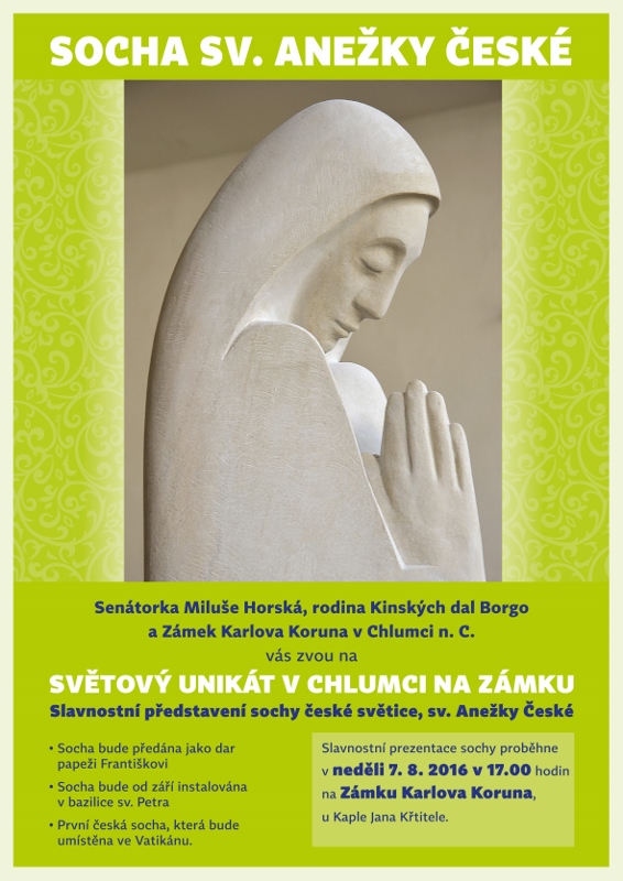 „Z hlediska moderních českých dějin bychom asi těžko hledali symboličtější historickou postavu, jejíž svatořečení sv. Janem Pavlem II v roku 1989 je spojené s koncem komunistického režimu a pronásledování náboženství, než je svatá Anežka. Jsme proto rádi, že sochu můžeme hostit na chlumeckém zámku, aby byla i zde ukázána veřejnosti“, doplňuje Francesco Kinský dal Borgo.