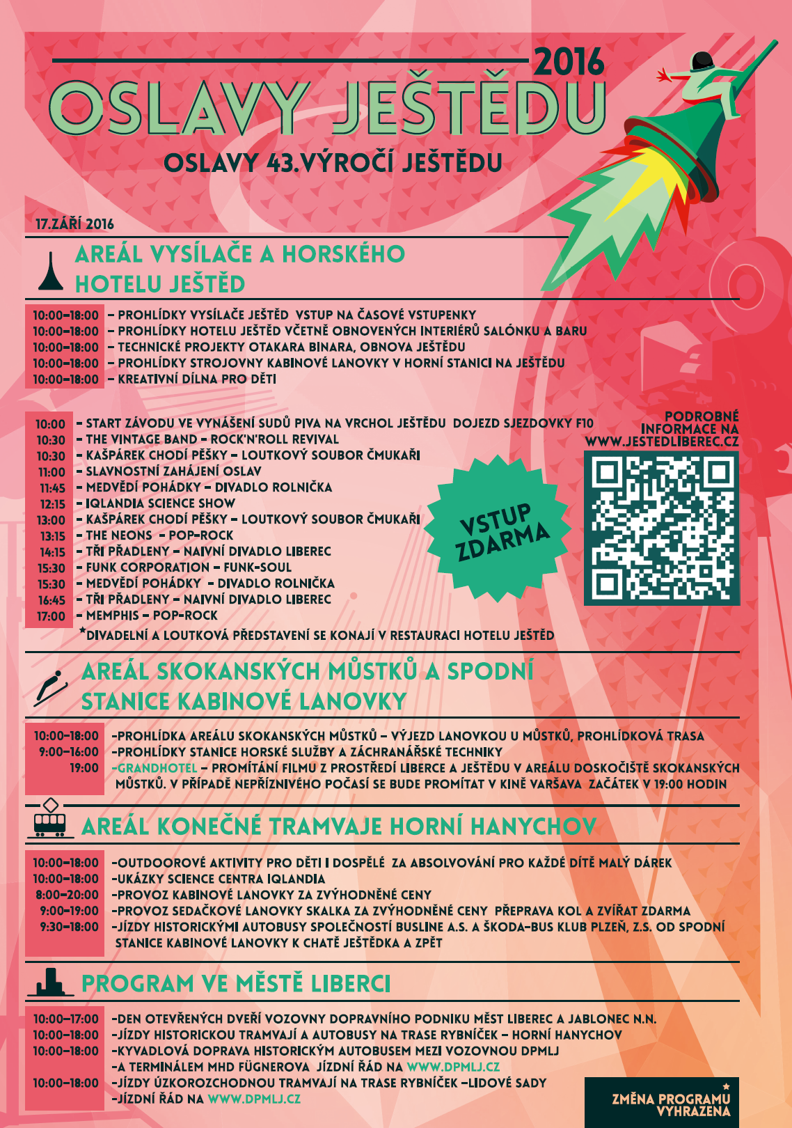 Oslavy Ještědu se konají v sobotu 17. září od 10.00. V letošním roce slaví vysílač už 43. výročí od svého otevření. Kromě divadelních představení pro děti, hudebních vystoupení a oudoorových aktivit se návštěvníci dozvědí informace o filmech natáčených na Ještědu, budou se moci podívat na reklamní spoty s Ještědem a večer je pro ně připraveno promítání filmu Grandhotel v areálu doskočiště skokanských můstků.
