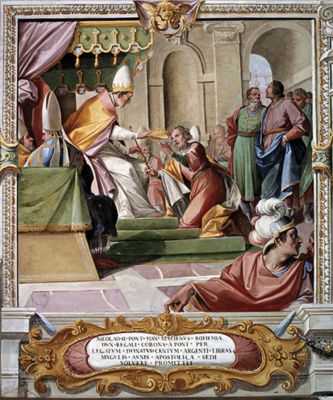 Spytihněvovy snahy o propůjčení královského titulu nevyšly. Přestože barokní malba a dole uvedený text hovoří jinak – připomínají spíše dotaz na Rádio Jerevan. Spytihněv nezískal z rukou papeže Mikuláše II. (1059–1061) právo nosit královskou korunu, jak můžete vidět na obraze, pouze mu bylo za roční poplatek sta liber stříbra z rukou papežského legáta propůjčeno právo nosit biskupskou mitru.