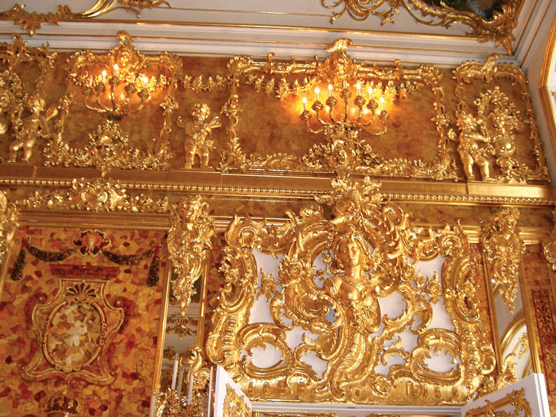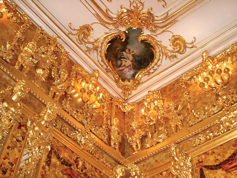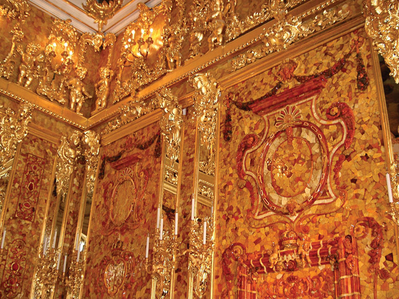 Zhotovena a instalována byla na přání pruského krále Fridricha I. v jeho berlínském zámku a je označována za osmý div světa. Přesto ji pruský král Fridrich Vilém roku 1716 vyměnil s ruským carem Petrem Velikým za vojáky. Petrova dcera Alžběta ji pak nechala nainstalovat nejprve v Zimním paláci a později v Kateřinském paláci u Petrohradu. Komnata byla italským architektem Rastrellim rozšířena o zrcadlové sloupy a zlacenou dřevořezbu. Sovětům se však na podzim roku 1941 nepodařilo komnatu demontovat, a tak byla po obsazení paláce wehrmachtem rozebrána a odeslána do Královce a stala se součástí Pruské sbírky. Po požáru zámku (1944) byla sejmuta a uložena v zámeckém sklepení. Osud komnaty v době evakuace roku 1945 není znám, ale literatura zmiňuje stovky míst, kde by mohla být ukryta. Přitom 6,5 tuny jantaru, 3,5 tuny stříbra a nálezné 10 % jsou dobrými důvody pro stovky hledačů. Za války došlo ke krádežím některých částí, které se našly v roce 1997 v Německu a poté byly vráceny Rusku. U příležitosti třístého výročí založení Petrohradu (2003) zde byla zpřístupněna kopie Jantarové komnaty.