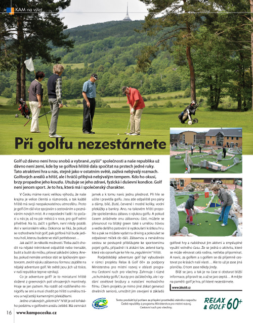 V Česku máme navíc velikou výhodu, že naše krajina je velice členitá a různorodá, a tak každé hřiště má svoji neopakovatelnou atmosféru. Proto je golf čím dál více spojován s cestováním a poznáváním nových míst. A v neposlední řadě i to počasí u nás je, až na pár měsíců v roce, pro golf velmi přívětivé. Na to, začít s golfem, není nikdy pozdě. Ani v seniorském věku. Dokonce se říká, že pokud se rozhodnete hrát golf, pak golfová hůl bude jedinou holí, kterou budete ve stáří potřebovat…