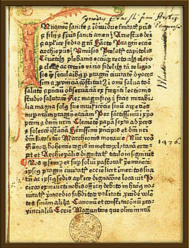Arcibiskup Arnošt z Pardubic ohlásil na prvním sněmu své církevní provincie, konaném roku 1349, nový církevní zákoník − Statuta Arnesti, který zůstal jako základ církevní organizace v Čechách v platnosti několik století. Po 127 letech se Statuta Arnesti stala nejstarší inkunábulí (prvotiskem) na našem území. Knihy však byly na našem území tištěny asi už roku 1473, snad kočovnými tiskaři. V Plzni byl také vytištěn překlad latinského díla Historia Troiana s názvem Kronika trojánská. Jak název napovídá, námětem této knihy bylo dobytí Troje. Tento prvotisk byl dříve považován za nejstarší v Čechách (1468), dnes se ale datuje do pozdějších let.