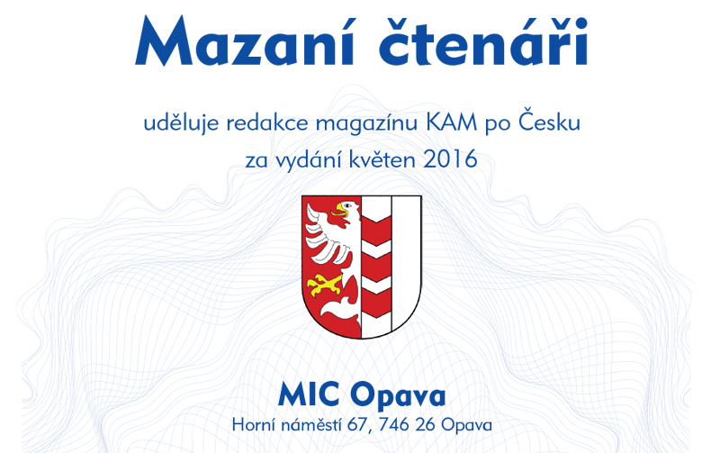 Nejvíce odpovědí na soutěžní otázky do redakce zaslali čtenáři z okolí distribučního místa Opava. Poměr počtu obyvatel v závislosti na počtu došlých odpovědí rozhodl, že prestižní certifikát Mazaní čtenáři uděluje redakce magazínu KAM po Česku za vydání květen 2016 MIC Opava, Horní náměstí 67, 746 26 Opava