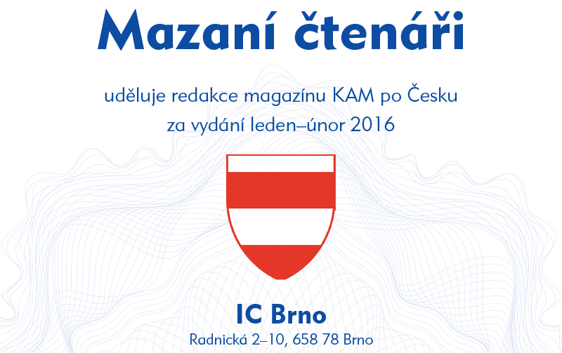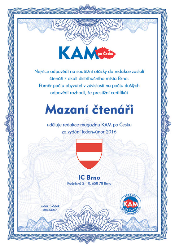 Nejvíce odpovědí na soutěžní otázky do redakce zaslali čtenáři z okolí distribučního místa Brno. Poměr počtu obyvatel v závislosti na počtu došlých odpovědí rozhodl, že prestižní certifikát Mazaní čtenáři uděluje redakce magazínu KAM po Česku za vydání leden–únor 2016 IC Brno, Radnická 2–10, 658 78 Brno