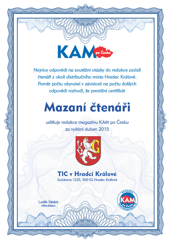 Nejvíce odpovědí na soutěžní otázky do redakce zaslali čtenáři z okolí distribučního místa Hradec Králové. Poměr počtu obyvatel v závislosti na počtu došlých odpovědí rozhodl, že prestižní certifikát Mazaní čtenáři uděluje redakce magazínu KAM po Česku za vydání duben 2015 TIC v Hradci Králové, Gočárova 1225, 500 02 Hradec Králové