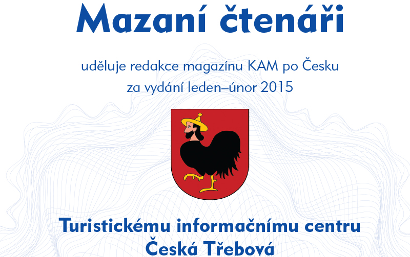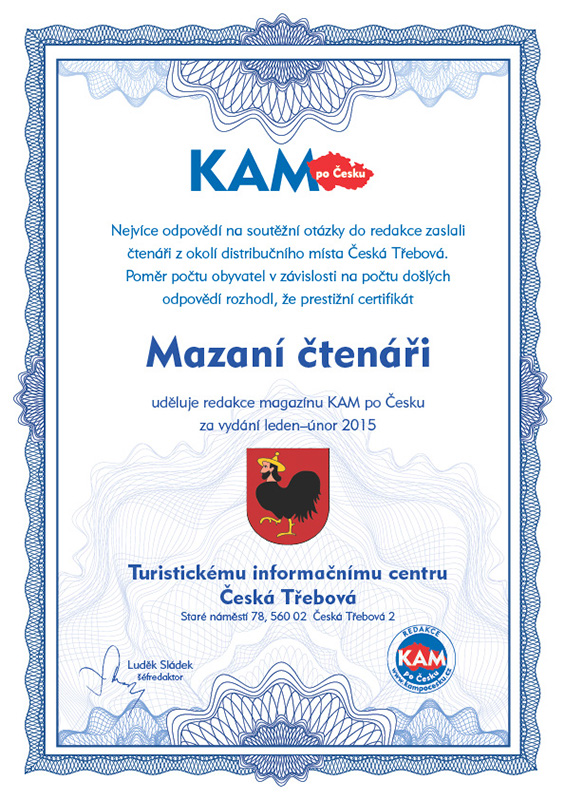 Nejvíce odpovědí na soutěžní otázky do redakce zaslali čtenáři z okolí distribučního místa Česká Třebová. Poměr počtu obyvatel v závislosti na počtu došlých odpovědí rozhodl, že prestižní certifikát Mazaní čtenáři uděluje redakce magazínu KAM po Česku za vydání leden–únor 2015 Turistickému informačnímu centru Česká Třebová, Staré náměstí 78, 560 02 Česká Třebová 2