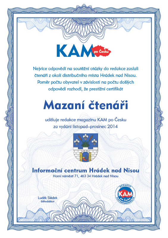 Nejvíce odpovědí na soutěžní otázky do redakce zaslali čtenáři z okolí distribučního místa Hrádek nad Nisou. Poměr počtu obyvatel v závislosti na počtu došlých odpovědí rozhodl, že prestižní certifikát Mazaní čtenáři uděluje redakce magazínu KAM po Česku za vydání listopad–prosinec 2014 Informační centrum Hrádek nad Nisou, Horní náměstí 71, 463 34 Hrádek nad Nisou
