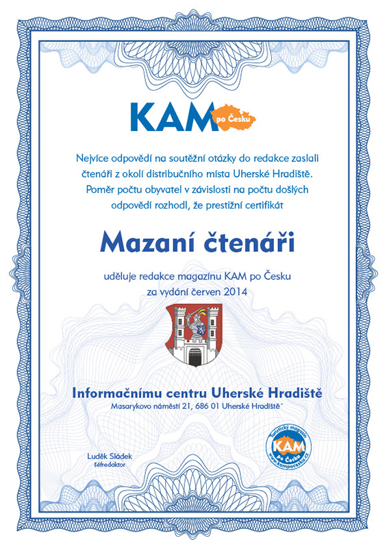 Nejvíce odpovědí na soutěžní otázky do redakce zaslali čtenáři z okolí distribučního místa Uherské Hradiště. Poměr počtu obyvatel v závislosti na počtu došlých odpovědí rozhodl, že prestižní certifikát Mazaní čtenáři uděluje redakce magazínu KAM po Česku za vydání červen 2014 Informačnímu centru Uherské Hradiště, Masarykovo náměstí 21, 686 01 Uherské Hradiště
