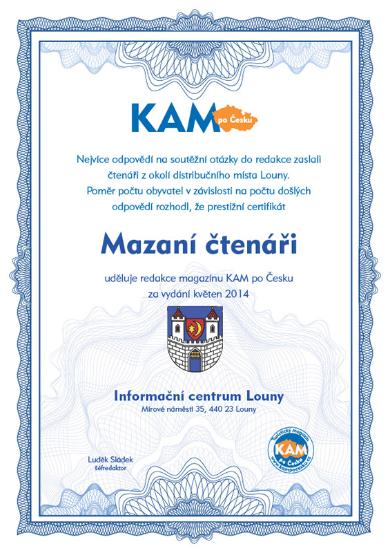 Nejvíce odpovědí na soutěžní otázky do redakce zaslali čtenáři z okolí distribučního místa Louny. Poměr počtu obyvatel v závislosti na počtu došlých odpovědí rozhodl, že prestižní certifikát Mazaní čtenáři uděluje redakce magazínu KAM po Česku za vydání květen 2014 Informační centrum Louny, Mírové náměstí 35, 440 23 Louny