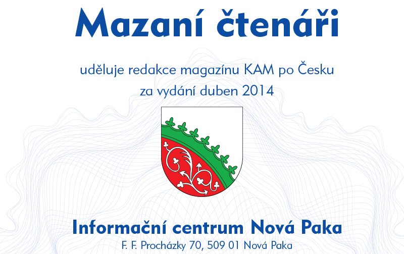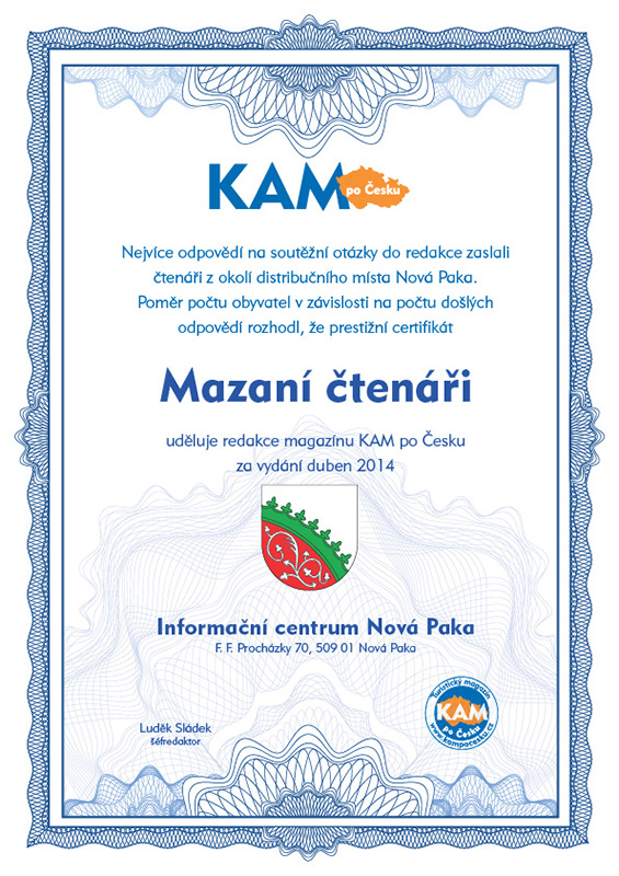 Nejvíce odpovědí na soutěžní otázky do redakce zaslali čtenáři z okolí distribučního místa Nová Paka. Poměr počtu obyvatel v závislosti na počtu došlých odpovědí rozhodl, že prestižní certifikát Mazaní čtenáři uděluje redakce magazínu KAM po Česku za vydání duben 2014 Informační centrum Nová Paka, F. F. Procházky 70, 509 01 Nová Paka