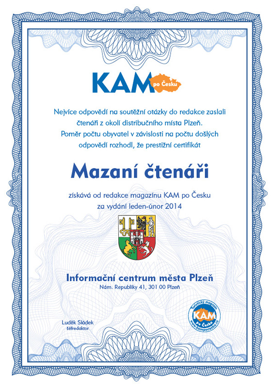 Nejvíce odpovědí na soutěžní otázky do redakce zaslali čtenáři z okolí distribučního místa Plzeň. Poměr počtu obyvatel v závislosti na počtu došlých odpovědí rozhodl, že prestižní certifikát Mazaní čtenáři uděluje redakce magazínu KAM po Česku za vydání leden-únor 2014 Informační centrum města Plzeň, Nám. Republiky 41, 301 00 Plzeň