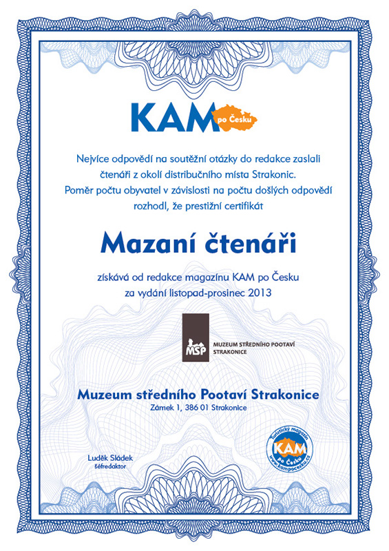 Nejvíce odpovědí na soutěžní otázky do redakce zaslali čtenáři z okolí distribučního místa Strakonic. Poměr počtu obyvatel v závislosti na počtu došlých odpovědí rozhodl, že prestižní certifikát Mazaní čtenáři uděluje redakce magazínu KAM po Česku za vydání listopad-prosinec 2013 Muzeum středního Pootaví Strakonice, Zámek 1, 386 01 Strakonice