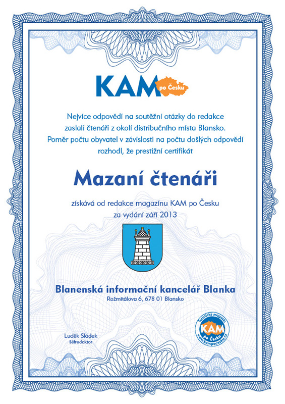 Nejvíce odpovědí na soutěžní otázky do redakce zaslali čtenáři z okolí distribučního místa Blansko. Poměr počtu obyvatel v závislosti na počtu došlých odpovědí rozhodl, že prestižní certifikát Mazaní čtenáři uděluje redakce magazínu KAM po Česku za vydání září 2013 Blanenská informační kancelář Blanka, Rožmitálova 6, 678 01 Blansko