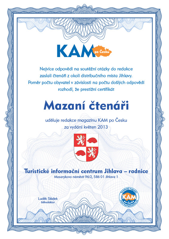 Nejvíce odpovědí na soutěžní otázky do redakce zaslali čtenáři z okolí distribučního místa Jihlavy. Poměr počtu obyvatel v závislosti na počtu došlých odpovědí rozhodl, že prestižní certifikát Mazaní čtenáři uděluje redakce magazínu KAM po Česku za vydání květen 2013 Turistické informační centrum Jihlava – radnice, Masarykovo náměstí 96/2, 586 01 Jihlava 1