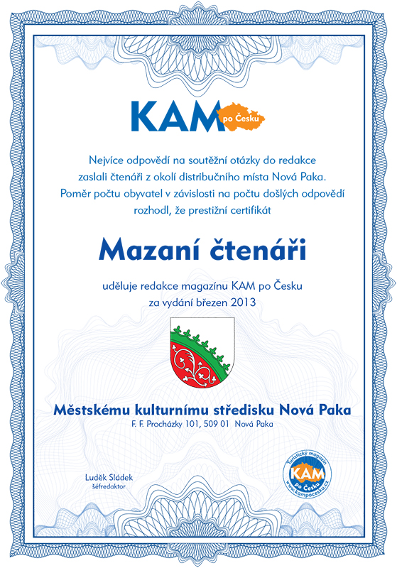Nejvíce odpovědí na soutěžní otázky do redakce zaslali čtenáři z okolí distribučního místa Nová Paka. Poměr počtu obyvatel v závislosti na počtu došlých odpovědí rozhodl, že prestižní certifikát Mazaní čtenáři uděluje redakce magazínu KAM po Česku za vydání březen 2013 Městskému kulturnímu středisku Nová Paka, F. F. Procházky 101, 509 01 Nová Paka