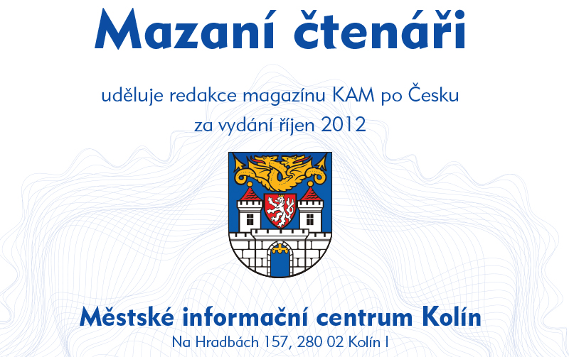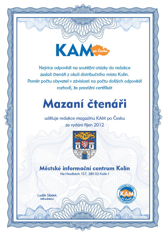 Nejvíce odpovědí na soutěžní otázky do redakce zaslali čtenáři z okolí distribučního místa Kolín. Poměr počtu obyvatel v závislosti na počtu došlých odpovědí rozhodl, že prestižní certifikát Mazaní čtenáři uděluje redakce magazínu KAM po Česku za vydání říjen 2012 Městské informační centrum Kolín, Na Hradbách 157, 280 02 Kolín I