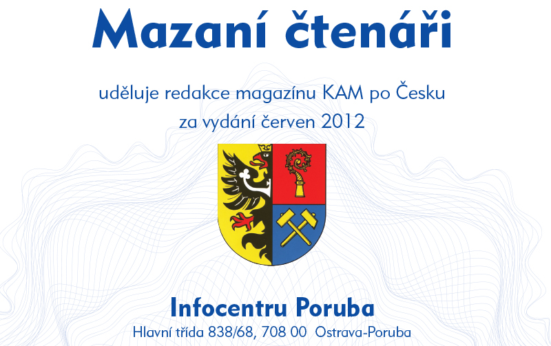 Nejvíce odpovědí na soutěžní otázky do redakce zaslali čtenáři z okolí distribučního místa Ostrava-Poruba. Poměr počtu obyvatel v závislosti na počtu došlých odpovědí rozhodl, že prestižní certifikát Mazaní čtenáři uděluje redakce magazínu KAM po Česku za vydání červen 2012 Infocentru Poruba, Hlavní třída 838/68, 708 00 Ostrava-Poruba