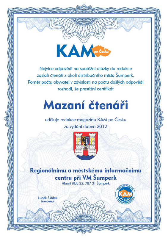 Nejvíce odpovědí na soutěžní otázky do redakce zaslali čtenáři z okolí distribučního místa Šumperk. Poměr počtu obyvatel v závislosti na počtu došlých odpovědí rozhodl, že prestižní certifikát Mazaní čtenáři uděluje redakce magazínu KAM po Česku za vydání duben 2012 Regionálnímu a městskému informačnímu centru při VM Šumperk, Hlavní třída 22, 787 31 Šumperk