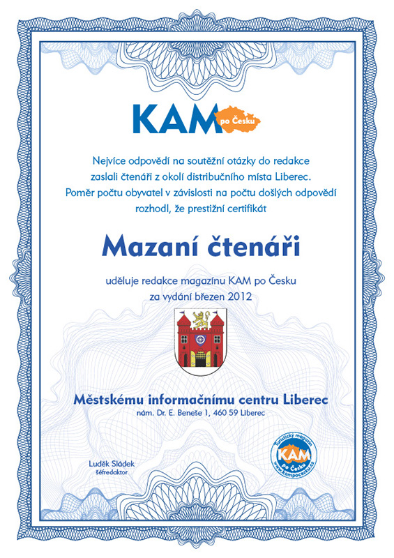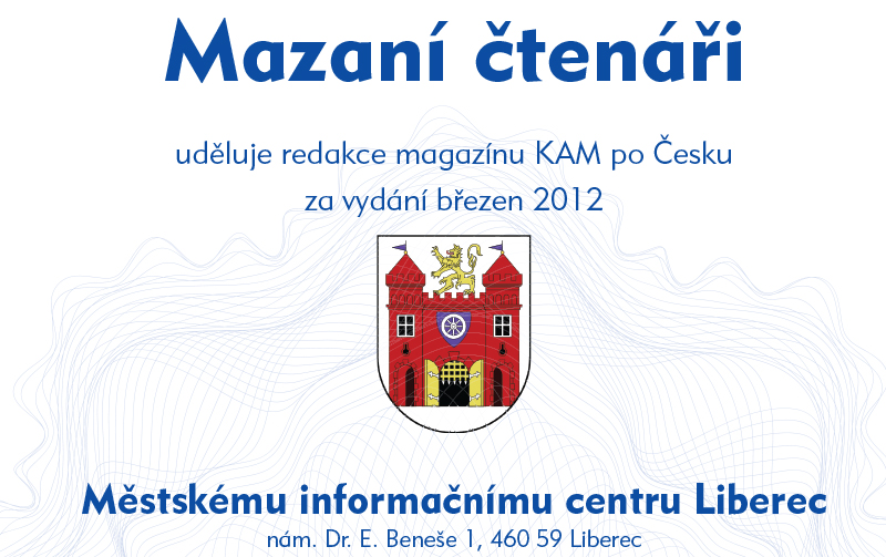 Nejvíce odpovědí na soutěžní otázky do redakce zaslali čtenáři z okolí distribučního místa Liberec. Poměr počtu obyvatel v závislosti na počtu došlých odpovědí rozhodl, že prestižní certifikát Mazaní čtenáři uděluje redakce magazínu KAM po Česku za vydání březen 2012 Městskému informačnímu centru Liberec, nám. Dr. E. Beneše 1, 460 59 Liberec