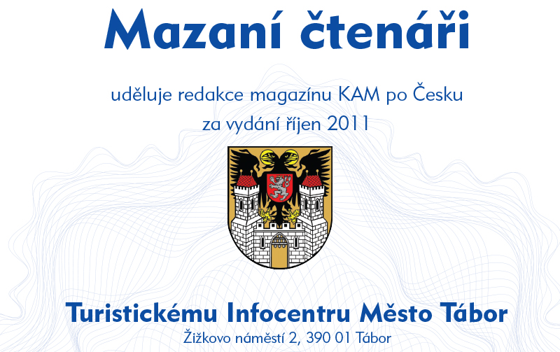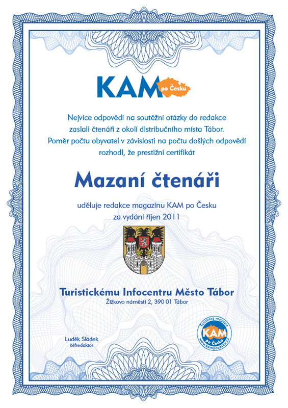 Nejvíce odpovědí na soutěžní otázky do redakce zaslali čtenáři z okolí distribučního místa Tábor. Poměr počtu obyvatel v závislosti na počtu došlých odpovědí rozhodl, že prestižní certifikát Mazaní čtenáři uděluje redakce magazínu KAM po Česku za vydání říjen 2011 Turistickému Infocentru Město Tábor, Žižkovo náměstí 2, 390 01 Tábor
