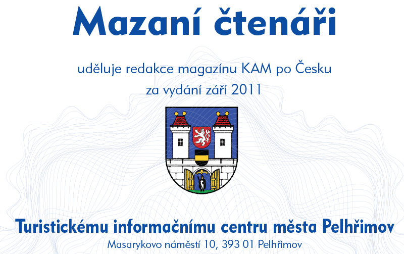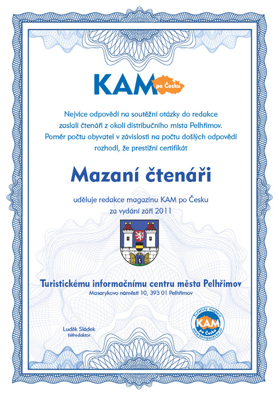 Nejvíce odpovědí na soutěžní otázky do redakce zaslali čtenáři z okolí distribučního místa Pelhřimov. Poměr počtu obyvatel v závislosti na počtu došlých odpovědí rozhodl, že prestižní certifikát Mazaní čtenáři uděluje redakce magazínu KAM po Česku za vydání září 2011 Turistickému informačnímu centru města Pelhřimov, Masarykovo náměstí 10, 393 01 Pelhřimov