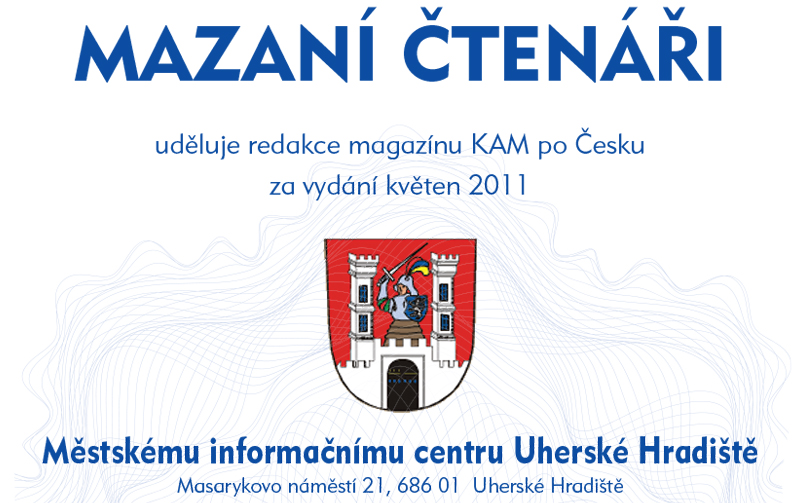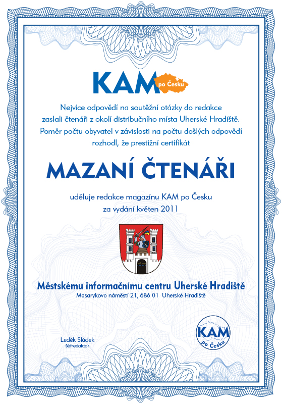 Nejvíce odpovědí na soutěžní otázky do redakce zaslali čtenáři z okolí distribučního místa Uherské Hradiště. Poměr počtu obyvatel v závislosti na počtu došlých odpovědí rozhodl, že prestižní certifikát Mazaní čtenáři uděluje redakce magazínu KAM po Česku za vydání květen 2011 Městskému informačnímu centru Uherské Hradiště, Masarykovo náměstí 21, 686 01 Uherské Hradiště