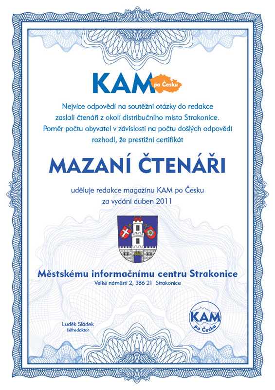 Nejvíce odpovědí na soutěžní otázky do redakce zaslali čtenáři z okolí distribučního místa Strakonice. Poměr počtu obyvatel v závislosti na počtu došlých odpovědí rozhodl, že prestižní certifikát Mazaní čtenáři uděluje redakce magazínu KAM po Česku za vydání duben 2011 Městskému informačnímu centru Strakonice, Velké náměstí 2, 386 21 Strakonice