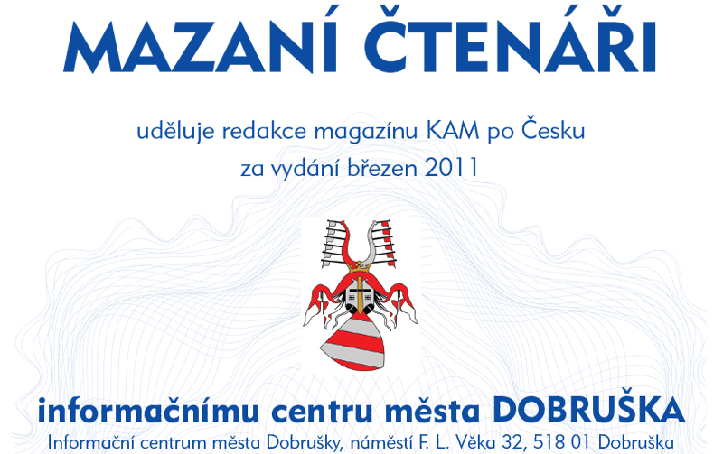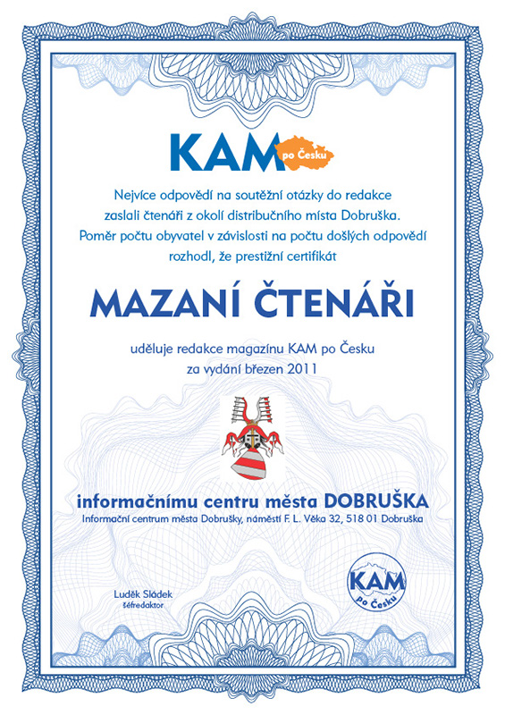 Nejvíce odpovědí na soutěžní otázky do redakce zaslali čtenáři z okolí distribučního místa Dobruška. Poměr počtu obyvatel v závislosti na počtu došlých odpovědí rozhodl, že prestižní certifikát Mazaní čtenáři uděluje redakce magazínu KAM po Česku za vydání březen 2011 informačnímu centru města DOBRUŠKA, Informační centrum města Dobrušky, náměstí F. L. Věka 32, 518 01 Dobruška