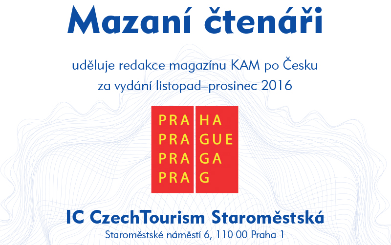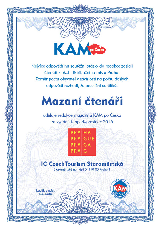 Nejvíce odpovědí na soutěžní otázky do redakce zaslali čtenáři z okolí distribučního místa Praha. Poměr počtu obyvatel v závislosti na počtu došlých odpovědí rozhodl, že prestižní certifikát Mazaní čtenáři uděluje redakce magazínu KAM po Česku za vydání listopad–prosinec 2016 IC CzechTourism Staroměstská, Staroměstské náměstí 6, 110 00 Praha 1