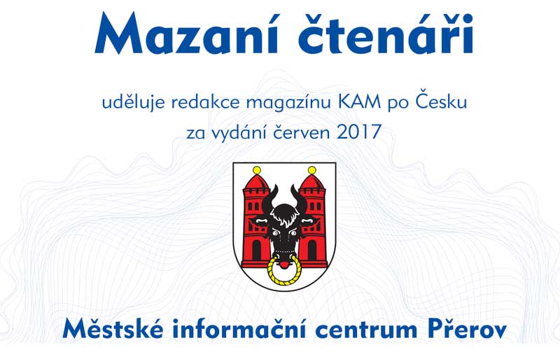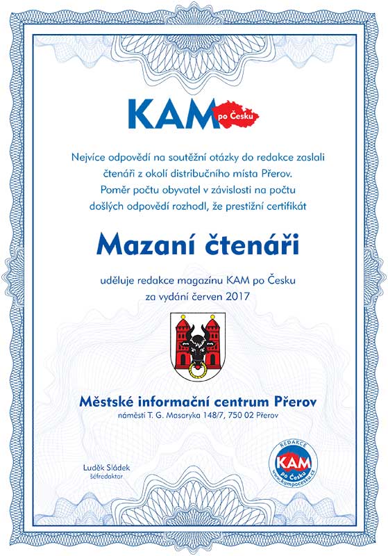 Nejvíce odpovědí na soutěžní otázky do redakce zaslali čtenáři z okolí distribučního místa Přerov. Poměr počtu obyvatel v závislosti na počtu došlých odpovědí rozhodl, že prestižní certifikát Mazaní čtenáři uděluje redakce magazínu KAM po Česku za vydání červen 2017 Městské informační centrum Přerov, náměstí T. G. Masaryka 148/7, 750 02 Přerov